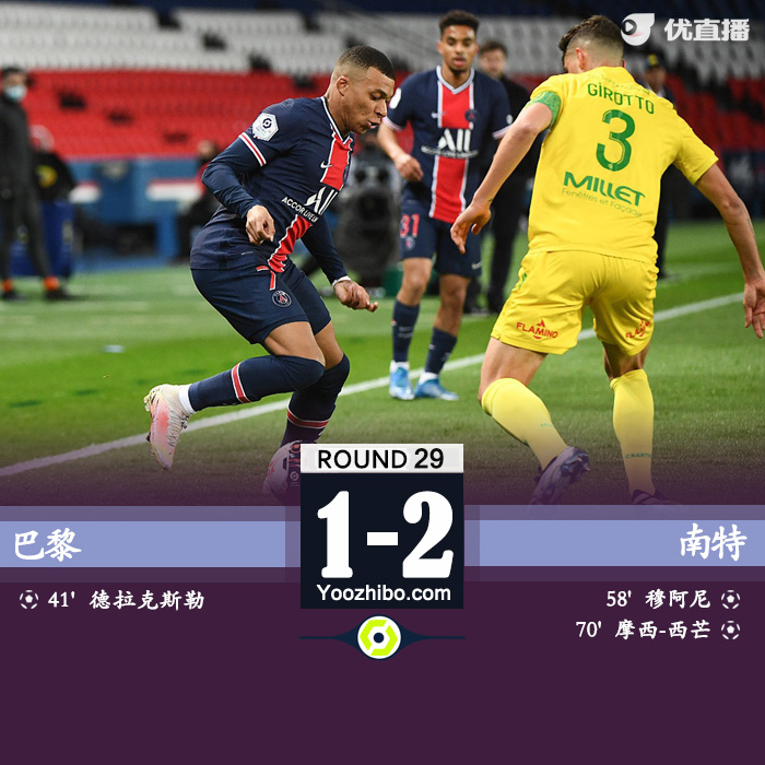 优直播3月15日讯 北京时间03月15日星期一04:00,法甲第29轮巴黎圣日耳曼主场迎战南特。上半场,德拉克斯勒破门,巴黎半场1-0领先南特。下半场,姆巴佩回传失误送礼,穆阿尼传射,西芒反超比分。最终,巴黎主场爆冷1-2遭南特逆转。