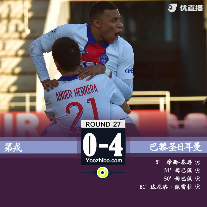 优直播2月28日讯 北京时间2月28日0点,法甲第27轮巴黎圣日耳曼客场对阵第戎。上半场,基恩早早为巴黎取得领先,科雷亚造点,姆巴佩点射破门。下半场,姆巴佩梅开二度,达尼洛-佩雷拉终场前再入一球,全场比赛结束,巴黎圣日耳曼4-0第戎。本场比赛后巴黎在多胜一场的情况下反超里昂升到联赛第二,落后榜首的里尔1分。