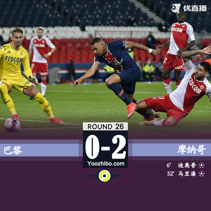优直播2月22日讯 北京时间2月22日4点,法甲第26轮焦点战巴黎圣日耳曼对阵摩纳哥,上半场,迪奥普早早帮助摩纳哥取得领先,巴黎在场上状态低迷,姆巴佩也是多次遭到抢断。下半场,马里潘为摩纳哥再下一城,本耶德尔错失良机,巴黎仍旧没有创造出威胁机会,全场比赛结束,摩纳哥2-0巴黎圣日耳曼。本场比赛过后,巴黎仍旧以54分排在联赛第三,摩纳哥拿到52分缩小和巴黎的差距。