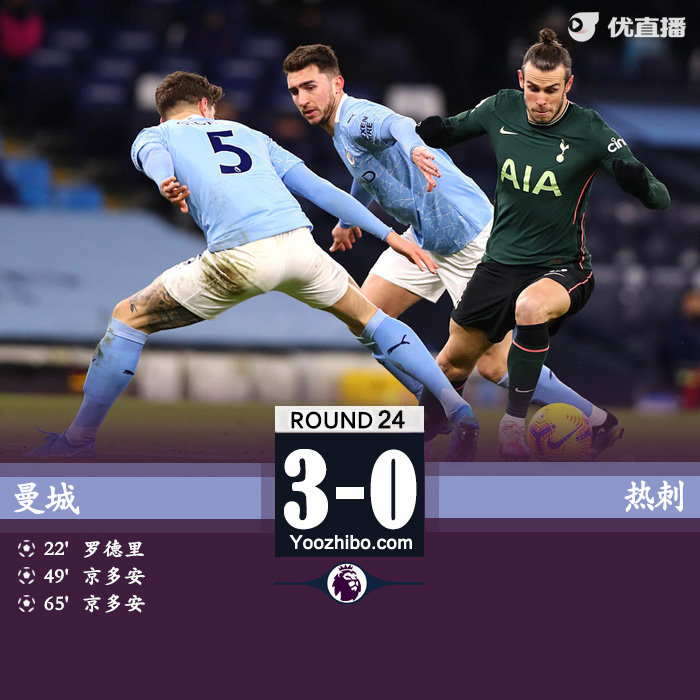 优直播2月14日讯 北京时间2月14日凌晨1点30分,2020-21赛季英超第24轮的焦点战在伊蒂哈德球场展开角逐,曼城坐镇主场迎战热刺。上半场凯恩任意球中框,罗德里点射打破僵局,下半场京多安梅开二度后伤退,埃德森献助攻。最终曼城主场3-0完胜热刺,蓝月亮豪取各项赛事16连胜,热刺近6场输掉5场。积分榜方面,曼城积53分继续领跑,热刺积36分位居第8名。
