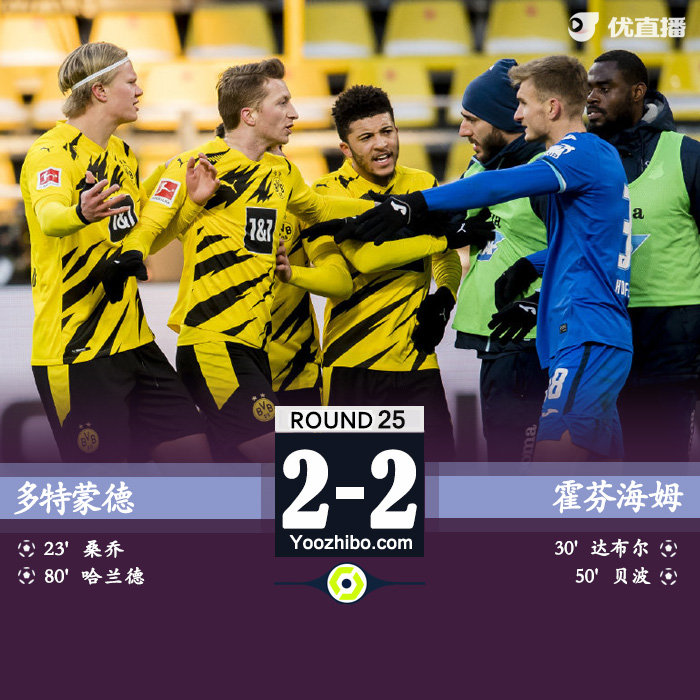 优直播2月14日讯 北京时间2月13日22:30,德甲联赛第21轮,多特蒙德主场迎战霍芬海姆。上半场比赛,阿坎吉失误希茨救险,格雷罗助攻桑乔单刀破门,鲁迪助攻达布尔扳平比分。下半场比赛,希茨扑救失误贝布破门,哈兰德抽射扳平比分。全场比赛结束,多特2-2战平霍芬海姆。
