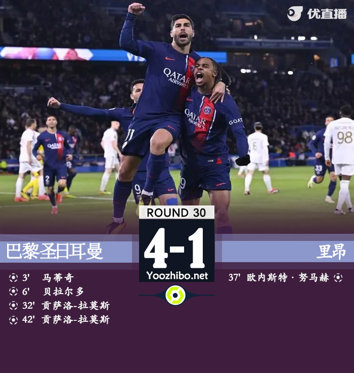 优直播讯:法国足球顶级联赛第30轮,巴黎圣日耳曼在主场迎战里昂。上半场,阿森西奥传球造成马蒂奇乌龙。3分钟后,贝拉尔多门前破门扩大领先优势。阿什拉夫传中,贡萨洛-拉莫斯头槌破门。随后,努瓦马低射为里昂扳回一城。阿森西奥传球,贡萨洛-拉莫斯铲射得分。下半场,两队均无建树。全场比赛结束,巴黎4-1轻取里昂。