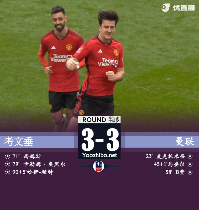 优直播讯:北京时间4月21日22:30,足总杯半决赛在温布利大球场继续进行,曼联对阵英冠球队考文垂,本场主裁判为罗伯特-琼斯。上半场,麦克托米奈首开记录,B费角球助攻马奎尔头槌再下一城。下半场,B费破门帮助曼联三球领先;随后场上风云突变,西姆斯传射,奥哈雷远射变线入网,万-比萨卡补时送点,哈吉-赖特点射绝平,考文垂连扳三城奇迹般将比赛拖入加时赛。加时赛中,B费与西姆斯先后中楣,托尔普绝杀无效。点球大战中,卡塞米罗罚失,奥纳纳扑点,本-谢夫打飞,霍伊伦罚入制胜点球。最终,曼联总比分7-5惊险淘汰考文垂,与曼城会师足总杯决赛。
