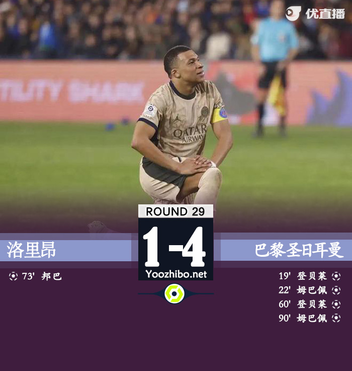 优直播讯:北京时间4月25日凌晨1:00,法甲第29轮,巴黎客场对阵洛里昂。上半场,登贝莱远射破门;姆巴佩左脚脚后跟建功。下半场,姆巴佩超强过人助攻登贝莱完成双响;邦巴扳回一球;最后阶段姆巴佩再入一球完成双响!最终,巴黎客场4-1击败洛里昂,若随后摩纳哥不胜,将直接夺得本赛季法甲冠军。