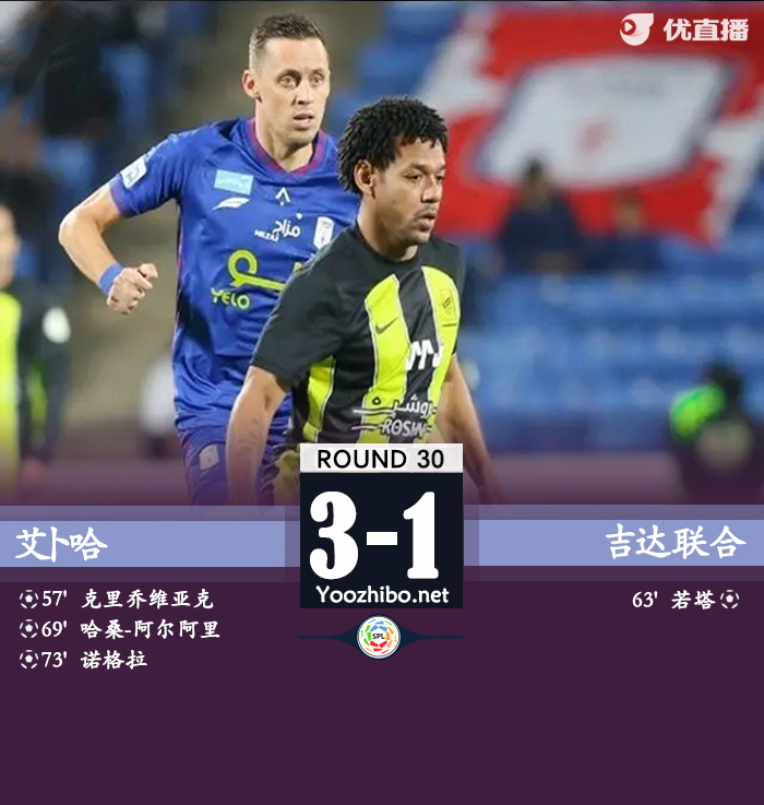 优直播讯:北京时间5月4日凌晨2时,沙特联第30轮,吉达联合客场挑战艾卜哈。上半场,艾哈迈德-阿尔加姆迪射门中框,双方都未能把握住进球机会,互交白卷;半场战罢,吉达联合暂0-0艾卜哈;下半场,卡马诺造点,克雷霍维亚点射破门为艾卜哈取得领先,罗马里尼奥造点,若塔点球被扑但自己补射破门扳平比分,随后,阿尔阿里和诺格拉连入两球再次将比分超出!全场比赛结束,吉达联合1-3艾卜哈,遭遇各赛事三连败!