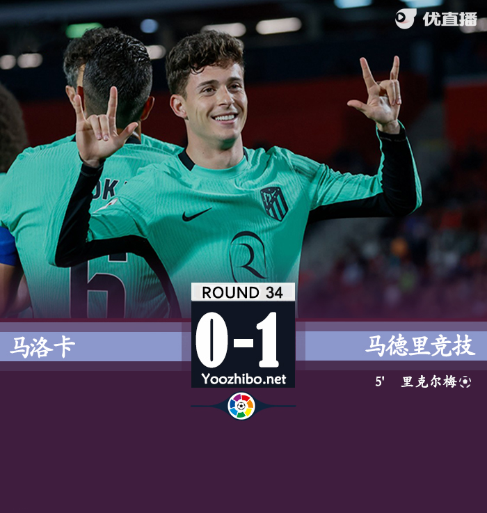 优直播讯:北京时间5月5日凌晨3时,西甲第34轮,马竞客场对阵马洛卡。上半场,里克尔梅首开纪录。马竞半场1-0领先马洛卡。下半场双方均无建树。最终马竞客场1-0击败马洛卡,取得联赛两连胜。本轮战罢,马竞继续排名西甲第四,领先第五名6分。