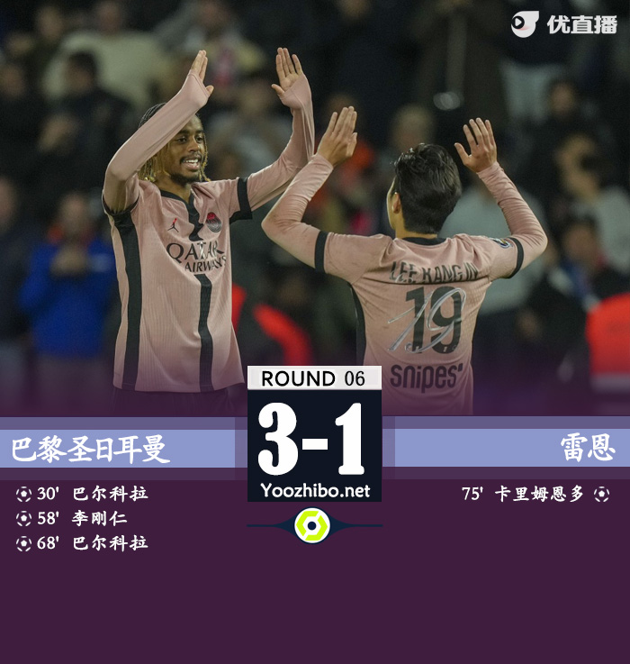 优直播讯 北京时间9月28日法甲第6轮巴黎圣日耳曼vs雷恩。上半场,马尔基尼奥斯开场破门越位微笑;巴尔科拉兜射破门。下半场,阿什拉夫进球同样越位无效;巴尔科拉兜射中柱,李刚仁补射空门得手;随后巴尔科拉再下一城!本场独造3球!贝拉尔多送点,卡里姆恩多点射破门。最终,巴黎3-1击败雷恩,6轮法甲狂轰20球!继续领跑积分榜。