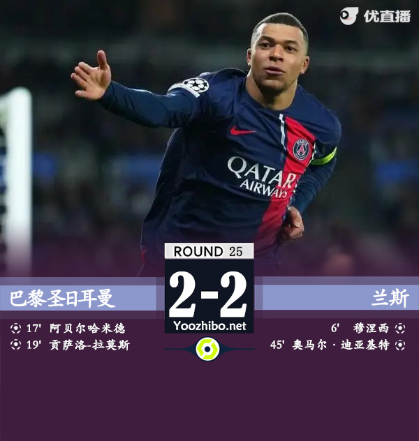 优直播讯 3月10日北京时间20:00,法甲第25轮,巴黎主场迎战兰斯。本场比赛姆巴佩近5轮第3次替补。上半场,阿什拉夫送大礼,穆涅西轻松破门。贡萨洛-拉莫斯2分钟之内造乌龙+破门,迪亚基特半场尾声单刀扳平比分;下半场,姆巴佩第73分钟替补登场。最终,巴黎2-2战平兰斯,联赛遭遇三连平!积分榜仍10分领跑。