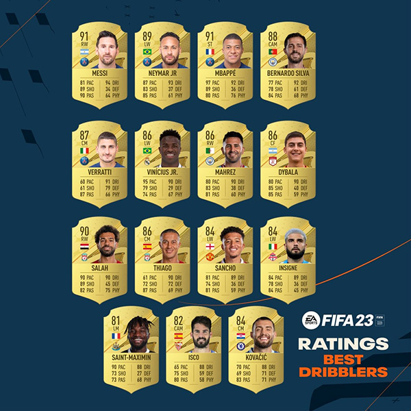 优直播讯 9月18日讯 EA公布FIFA23盘带TOP15,梅西94居首,内马尔93第二,姆巴佩、B席92并列第三。