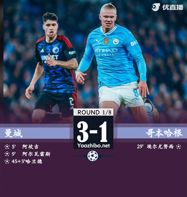 优直播讯 北京时间3月7日凌晨4:00,2023-24赛季欧冠1/8决赛次回合,曼城坐镇伊蒂哈德球场迎战哥本哈根,首回合蓝月亮3-1获胜。上半场阿尔瓦雷斯开场9分钟传射建功,阿坎吉破门,埃尔尤努西扳回一球,补时阶段哈兰德进球,曼城暂3-1哥本哈根;下半场努内斯摔倒导致手指90°弯折受伤,随后被换下,两队都没有再改写比分,最终曼城3-1哥本哈根,总比分6-2晋级1/4决赛。