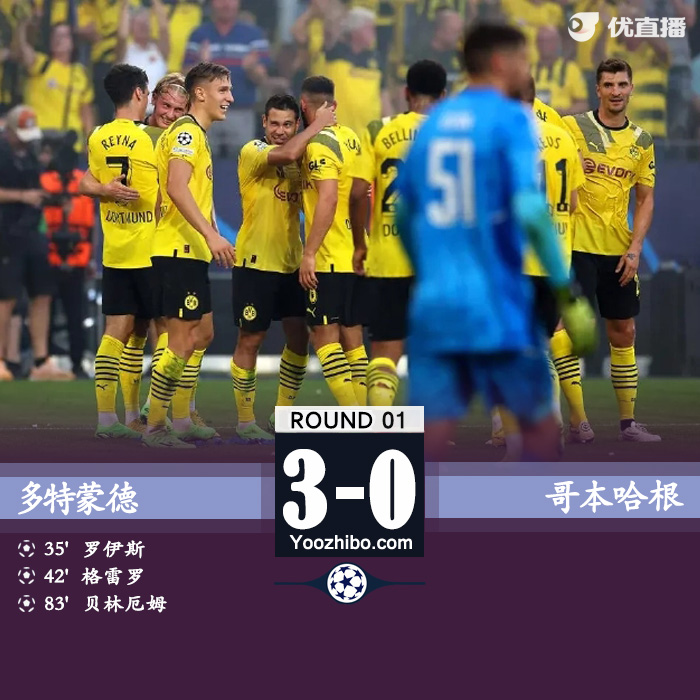优直播讯北京时间9月7日0时45分,欧冠小组赛第1轮展开角逐,多特蒙德坐镇主场迎战哥本哈根。上半场,罗伊斯破僵,格雷罗低射扩大比分。半场多特2-0领先。下半场,贝林厄姆再下一城。最终多特主场3-0取得欧冠开门红。