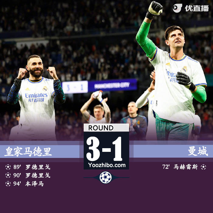 优直播讯5月5日讯 北京时间5月5日凌晨3:00,2021-22赛季欧冠半决赛次回合,皇马主场迎战曼城,上半场两队均有几次威胁攻势,但没能取得进球,半场皇马0-0曼城;下半场马赫雷斯破门,罗德里戈常规时间最后时刻扳平比分,随后补射阶段再次破门,皇马2-1曼城,总比分5-5,比赛进入加时;加时赛上半场,本泽马被鲁本-迪亚斯铲倒,皇马得到点球,本泽马主罚命中,加时赛下半场两队均无建树,最终皇马加时3-1击败曼城,总比分6-5淘汰对手进入决赛。