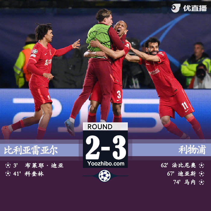 优直播讯5月4日讯 北京时间5月4日凌晨3点整,2021-22赛季欧冠半决赛次回合在陶瓷球场展开角逐,利物浦客场挑战比利亚雷亚尔。上半场迪亚首开纪录,科奎林头球建功,下半场法比尼奥扳回一城,迪亚斯替补扳平,马内反超比分,卡普埃染红。最终利物浦客场3-2逆转比利亚雷亚尔,总比分利物浦5-2淘汰比利亚雷亚尔晋级欧冠决赛。