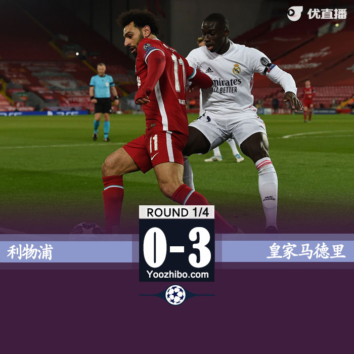 优直播4月15日讯 北京时间04月15日星期四03:00,欧冠1/4决赛次回合利物浦主场迎战皇家马德里。上半场,库尔图瓦扑出萨拉赫单刀,本泽马射门折射中柱,红军狂攻无果,利物浦半场暂0-0皇马。下半场,双方互有攻守皆无明显破门机会。最终,皇马0-0总分3-1利物浦,晋级四强将对阵切尔西。