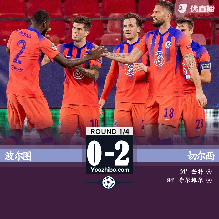优直播4月8日讯 北京时间04月08日星期四03:00,欧冠1/4决赛首回合波尔图迎战切尔西。上半场比赛,若日尼奥助攻,芒特破门,切尔西半场1-0领先波尔图,蓝军上半场仅仅一脚射门就取得进球。下半场,普利西奇射门中框,奇尔维尔扩大比分。最终,波尔图0-2不敌切尔西。两队4月14日的次回合交锋,仍将在皮斯胡安球场进行。