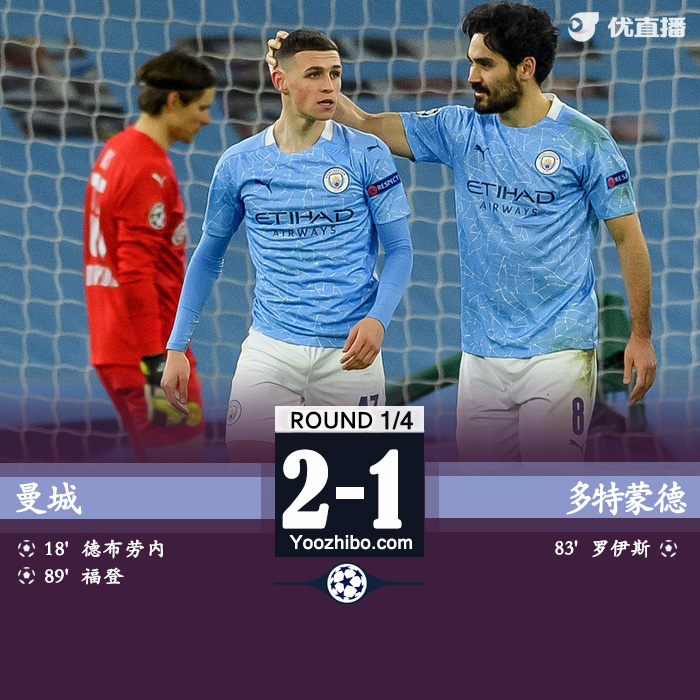 优直播4月7日讯 北京时间04月07日星期三03:00,欧冠1/4决赛首回合曼城在主场迎战多特蒙德。上半场,马赫雷斯助攻德布劳内首开记录,贝林厄姆抢断埃德森破门被吹,曼城半场1-0领先多特。下半场,哈兰德助攻罗伊斯扳平,京多安助攻福登绝杀。最终,首回合曼城主场2-1战胜多特。双方次回合,于04月15日星期四03:00进行。
