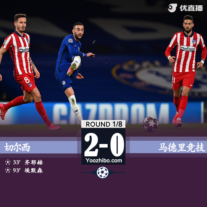 优直播3月18日讯 北京时间3月18日4点,欧冠联赛1/8决赛次回合一场比赛在切尔西和马竞之间进行。上半场卡拉斯科禁区内倒地主裁示意没有犯规,齐耶赫反击中破门。下半场萨维奇肘击直红离场,埃默森补时建功。最终切尔西主场2-0,总比分3-0击败马竞成功晋级欧冠八强。