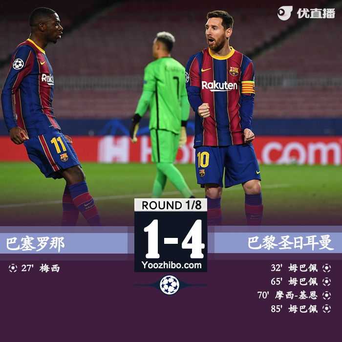 优直播2月17日讯 北京时间2月17日凌晨4点整,2020-21赛季欧冠1/8决赛首回合在诺坎普球场展开角逐,巴塞罗那坐镇主场迎战巴黎圣日耳曼。上半场梅西点射打破僵局,姆巴佩扳平比分,下半场姆巴佩上演帽子戏法,基恩破门。最终巴塞罗那主场1-4遭巴黎圣日耳曼逆转,双方将于3月11日移师巴黎王子公园球场进行次回合较量。