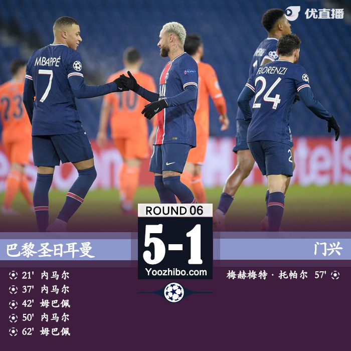 优直播讯:北京时间12月10日凌晨1:55,2020-2021赛季欧冠小组赛H组第6轮,巴黎圣日耳曼与伊斯坦布尔的比赛恢复进行。上半时比赛内马尔梅开二度后造点,姆巴佩点射一蹴而就扩大优势。下半时比赛内马尔世界波破门成功戴帽,托帕尔为客队追回一球,迪马利亚随后助攻姆巴佩再下一城锦上添花。最终,巴黎圣日耳曼5-1击败伊斯坦布尔头名出线。