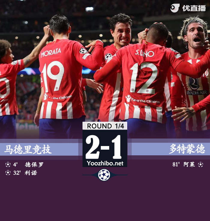 优直播讯:北京时间4月11日欧冠1/4决赛首回合,马德里竞技主场对阵多特蒙德。上半场德保罗抢断首开记录,维特塞尔蝎子摆尾打门被扑,利诺破门扩大比分,下半场阿莱扳回一球,布兰特中柱。最终比分马竞2-1多特蒙德。