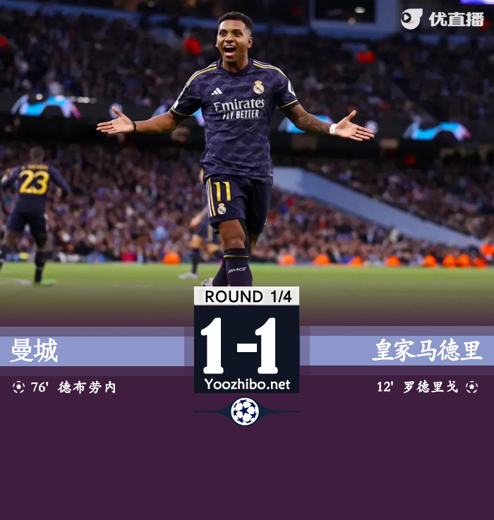 优直播讯:北京时间4月18日欧洲冠军联赛 1/4决赛次回合,曼城主场对阵皇家马德里。上半场,罗德里戈两连击破门,哈兰德头球攻门击中横梁,德布劳内远射被扑,格拉利什抽射变线偏出,德布劳内角球直奔球门被卢宁指尖扑出;下半场,格拉利什凌空斩被挡,格拉利什扣过防守抽射还是被封堵,德布劳内小角度劲射入网,德布劳内迎球推射稍稍高出;加时赛阶段,沃克精彩完成对维尼修斯的单防,吕迪格近距离打门踢偏,卡瓦哈尔出现抽筋情况被换下;点球大战阶段,卢宁两度扑点帮助球队赢下比赛。最终比分曼城 3-4 皇马。两回合总比分曼城7-8皇马。
