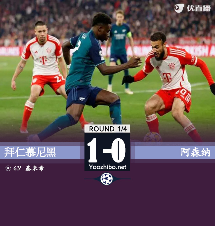 优直播讯:北京时间4月18日欧洲冠军联赛 1/4决赛次回合,拜仁慕尼黑主场对阵阿森纳。凯恩开场连续打门造险,穆西亚拉远射被扑,马丁内利推射被诺伊尔没收,下半场格雷茨卡和格雷罗先后中柱,基米希头球冲顶破门。最终比分拜仁 1-0 阿森纳。两回合总比分拜仁3-2阿森纳。