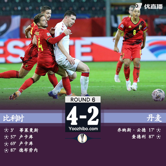 优直播讯:北京时间11月19日03:45(比利时当地时间18日20:45),2020/21赛季欧国联A组第2小组第6轮一场焦点战在鲁汶的皇权球场展开争夺,比利时主场4比2力克丹麦,蒂莱曼斯进球,卢卡库梅开二度,德布劳内传射。比利时夺得小组头名。