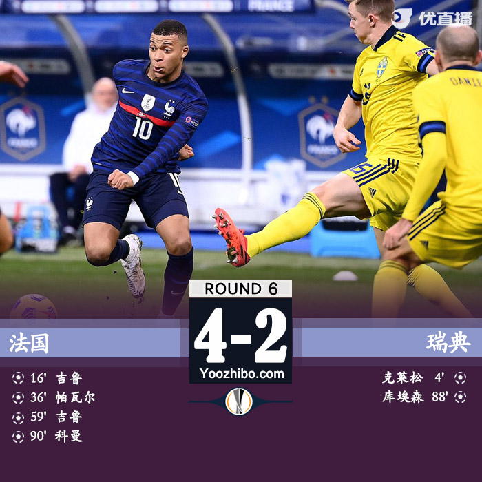 优直播讯:北京时间11月18日03:45(法国当地时间17日20:45),2020/21赛季欧国联A组第3小组第6轮一场焦点战在法兰西大球场展开争夺,法国主场4比2力克瑞典,吉鲁梅开二度,帕瓦尔和科曼进球。法国不败战绩夺得小组头名。