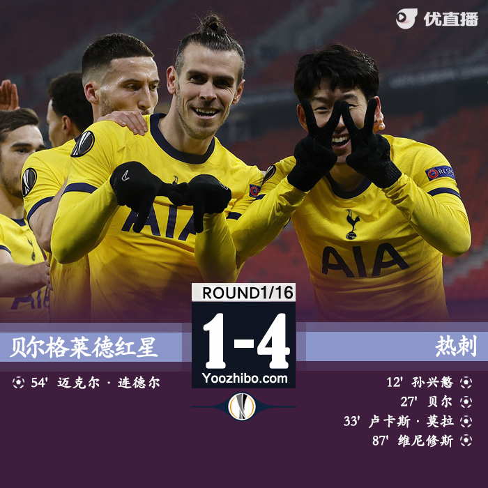 优直播2月19日讯 北京时间2月19日01:55,欧联杯1/16决赛首回合,沃尔夫斯贝格迎战热刺。上半场,孙兴慜头球首开记录,贝尔传射,小卢卡斯一条龙破门,热刺半场3-0领先沃尔夫斯贝格。下半场,西索科送点,维尼修斯破门。最终,热刺4-1战胜沃尔夫斯贝格。