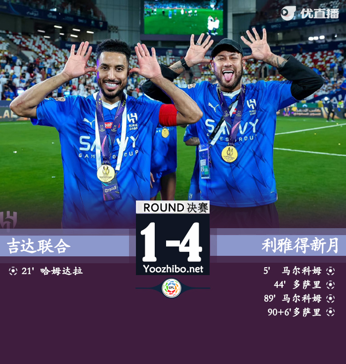 优直播讯:北京时间4月12日沙超杯决赛,吉达联合主场对阵利雅得新月。吉达联合哈默德破门。上半场,萨利赫-谢赫里助攻马尔科姆破门,率先改写比分。哈默德造点主罚被扑,补射将球打进将比分扳平。萨利赫-谢赫里助攻萨勒姆-达瓦萨里破门,将比分再次超出。下半场,哈默德越位在先,进球被吹无效。阿卜杜勒哈米德越位在先,进球被吹无效。马尔科姆破门完成梅开二度再下一城。纳赛尔-达乌萨里补射破门锁定比分。最终利雅得新月4-1战胜吉达联合取34连胜,夺得23~24赛季沙超杯冠军。