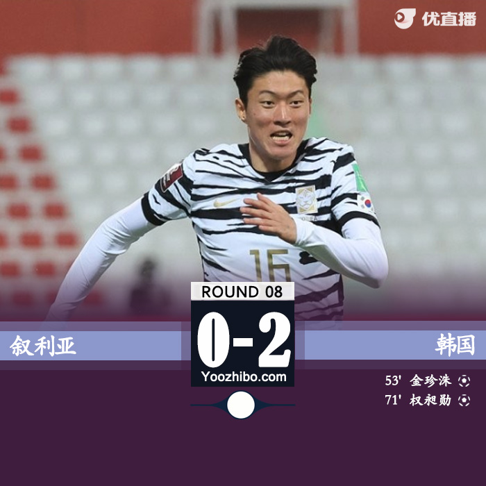 优直播2月1日讯 北京时间2月1日22:00,世界杯亚洲区预选赛12强赛A组第8轮,韩国对阵叙利亚。上半场,赫里宾头球破门但越位在先,金珍洙险些失误送礼,两队均未进球;下半场,金珍洙头球破门打破僵局,权昌勋世界波锁定胜局。最终,韩国2-0击败叙利亚,提前2轮获得世界杯参赛资格。
