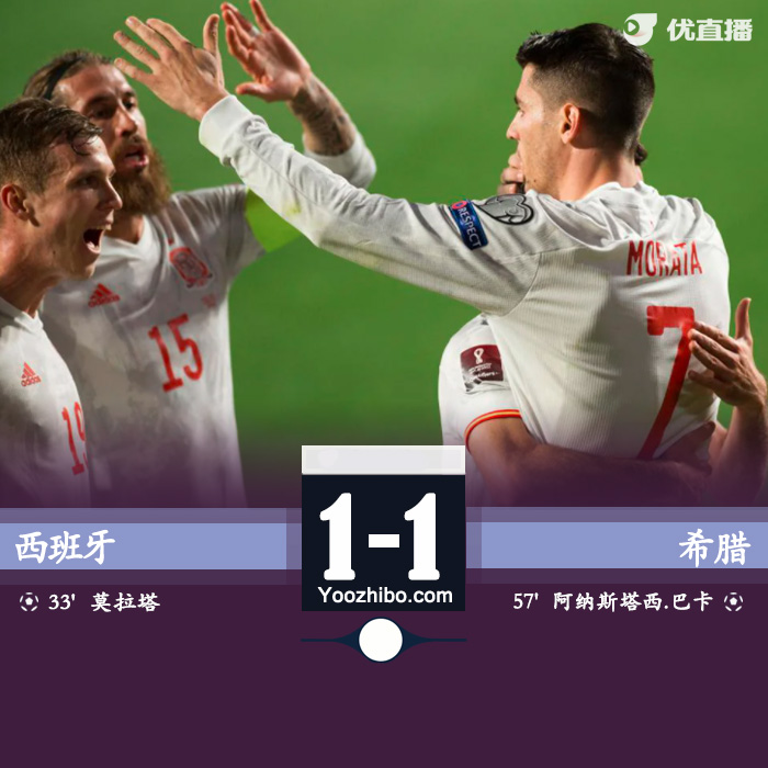 优直播3月26日讯 北京时间03月26日星期五03:45,世预赛欧洲区B组西班牙对阵希腊世界杯预选赛打响。上半场,科克助攻莫拉塔首开记录,半场西班牙1-0领先希腊。下半场,马丁内斯替补登场被判罚黄点套餐,巴卡斯塔斯点射扳平。最终,西班牙1-1战平希腊,双方各取1分。