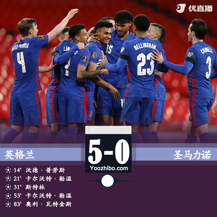 优直播3月26日讯 北京时间3月26日03:45,世界杯欧洲区预选赛I组首轮展开争夺,英格兰迎战圣马力诺。上半场,沃德-普劳斯打入国家队处子球,里斯-詹姆斯助攻勒温头球破门,芒特助攻斯特林扩大比分。下半场,林加德助攻勒温打进第4球,沃特金斯替补上场也打进国家队处子球,最终,英格兰5-0大胜圣马力诺,取得开门红。
