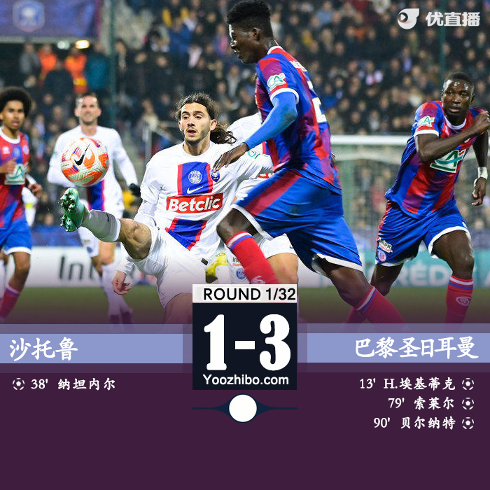 优直播讯北京时间1月7日凌晨4:00,法国杯1/32决赛,沙托鲁对阵巴黎圣日耳曼。上半场,加尔比助攻埃基蒂克破门,恩托拉扳平比分。下半场,索莱尔破门再次为巴黎取得领先!巴黎圣日耳曼3-1沙托鲁晋级下一轮!