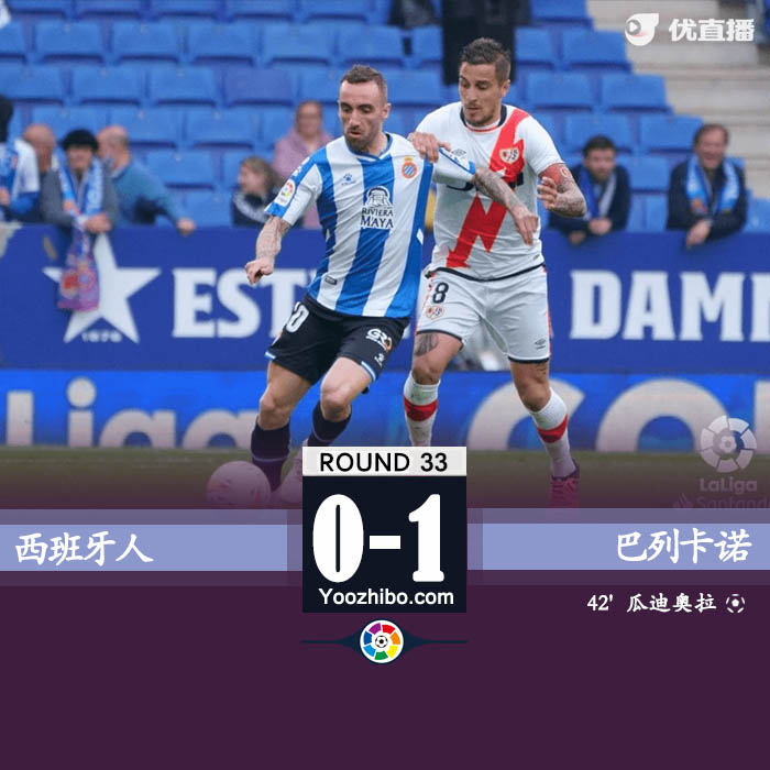 优直播讯 4月22日讯 北京时间今天1:00,西甲联赛第33轮西班牙人主场迎战巴列卡诺的比赛准时开始。上半场场面沉闷,中场阶段塞尔吉-瓜迪奥拉进球为巴列卡诺打开局面,半场西班牙人落后一球。下半场回来塞尔吉-瓜迪奥拉爆射中柱,武磊87分钟替补登场。全场结束西班牙人0-1不敌巴列卡诺联赛吞两连败。巴列卡诺凭借这场胜利终结十三轮不胜尴尬纪录。