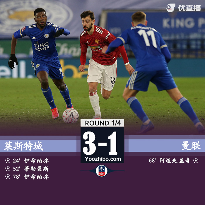 优直播3月22日讯 北京时间3月22日凌晨1点,20-21赛季足总杯1/4决赛,曼联客场挑战莱斯特城。上半时弗雷德回传失误,伊希纳乔笑纳大礼,博格巴助攻格林伍德扳平。下半时蒂莱曼斯一条龙突进破门,伊希纳乔完成梅开二度,瓦尔迪失良机。最终,莱斯特城3-1曼联,莱斯特城晋级足总杯四强,他的对手将是南安普顿。