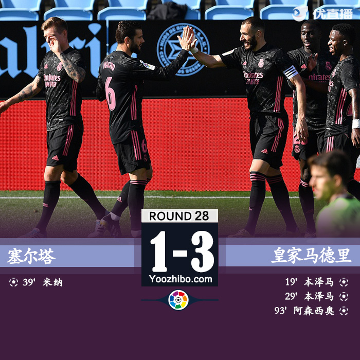 优直播3月21日讯 北京时间3月20日西甲联赛第28轮,塞尔塔主场面对皇家马德里。上半场比赛,克罗斯贡献两次助攻,本泽马梅开二度,维尼修斯面对半空门失良机,米纳头球破门扳回一城,半场战罢,皇马2-1客场领先塞尔塔。下半场开始,维尼修斯利用速度屡次冲击左路遭威胁,本泽马抓住对手失误险些戴帽,补时阶段阿森西奥破门。全场比赛战罢,皇马客场3-1客胜塞尔塔。