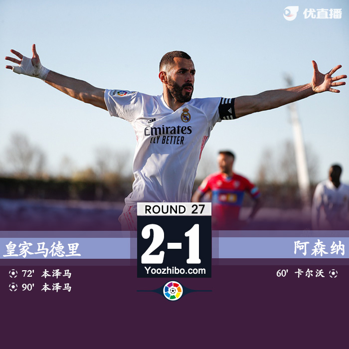 优直播3月14日讯 北京时间3月13日晚23点15分,2020-21赛季西甲第27轮在迪斯蒂法诺球场展开角逐,皇家马德里坐镇主场迎战埃尔切。上半场双方均无建树,下半场卡尔沃先拔头筹,本泽马头球扳平,阿扎尔复出替补登场,本泽马补时绝杀。最终皇家马德里主场2-1逆转埃尔切。积分榜方面,皇马落后榜首马竞5分,暂居第2名。