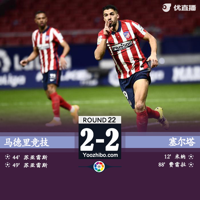 优直播2月9日讯 北京时间2月9日04:00,西甲第22轮继续进行,马德里竞技主场迎战塞尔塔。上半场,米纳冲顶帮塞尔塔取得领先,M-略伦特助攻苏亚雷斯铲射扳平比分。下半场,洛迪助攻苏亚雷斯再入一球反超比分,法昆多-费雷拉打入绝平进球。最终,马德里竞技2-2战平塞尔塔,八连胜遭终结,8分优势继续领跑积分榜。