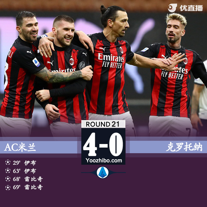优直播2月7日讯 北京时间2月7日22:00,意甲联赛第21轮一场比赛在AC米兰和克罗托内之间进行。上半场卡拉布里亚破门但因伊布越位在先进球无效,伊布推射打入个人俱乐部生涯500球。下半场特奥助攻伊布梅开二度,恰尔汗奥卢复出贡献两粒助攻,雷比奇一分钟双响。最终米兰4-0大胜克罗托内,在积分榜反超国米2分重回榜首。