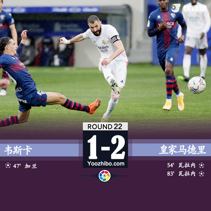 优直播2月7日讯 北京时间2月6日晚23点15分,2020-21赛季西甲第22轮在阿尔科拉斯球场展开角逐,皇家马德里客场挑战韦斯卡。上半场维尼修斯失良机,下半场加兰世界波,瓦拉内梅开二度,奥德里奥索拉伤退。最终皇家马德里客场2-1逆转战胜韦斯卡,积分榜方面,皇马积43分距榜首7分。