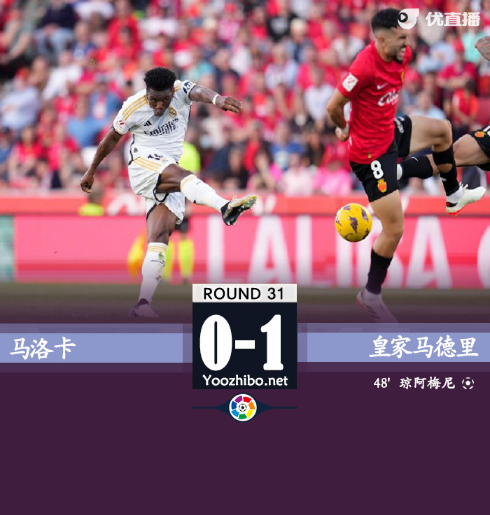 优直播讯:北京时间4月14日,西甲联赛第31轮,马略卡队主场迎战皇家马德里队。上半场,赖洛头球攻门被卢宁扑出,贝林厄姆远射击中门框。下半场,楚阿梅尼世界波破门,卜拉欣-迪亚斯抽射被扑,最终,皇马客场1-0马略卡迎联赛4连胜。