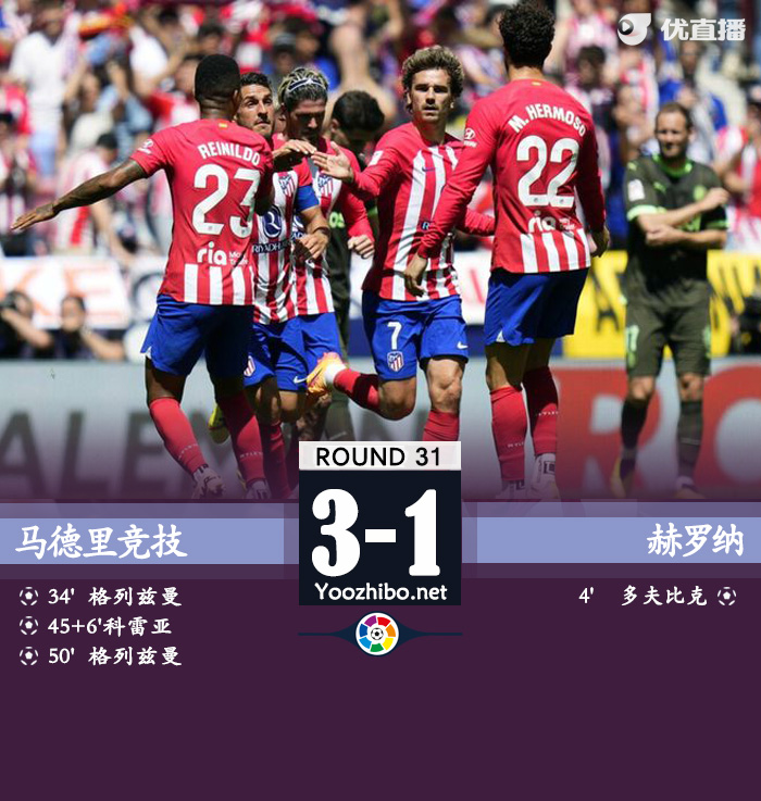 优直播讯:北京时间4月13日西甲联赛第31轮,马德里竞技主场迎战赫罗纳。格列兹曼为马德里竞技攻入两球,安赫尔-科雷亚也有一次得分。赫罗纳的多夫比克也有一次进球。最终比分是马竞3-1赫罗纳。
