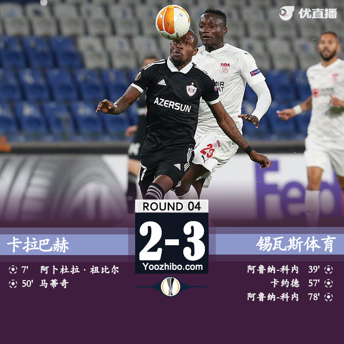 优直播讯:北京时间2020-11-27 01:55:00,欧联杯I组第4轮,卡拉巴克对阵锡瓦斯体育。锡瓦斯体育队科内点球射门成功。卡拉巴克队佐比尔,卡拉巴克队马蒂奇,锡瓦斯体育队卡约德,锡瓦斯体育队科内分别攻入一球。最终,锡瓦斯体育3-2小胜卡拉巴克。