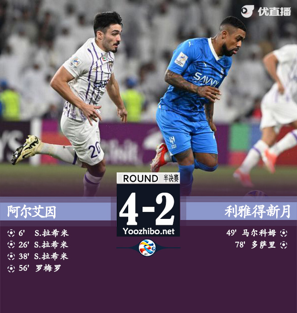 优直播讯:北京时间4月18日亚洲足球冠军联赛 半决赛首回合,艾因主场对阵利雅得新月。上半场刚开始,纳迪尔送出助攻,拉希米前插推射远角破门先拔头筹,哈姆丹禁区转身小角度抽射被挡出,拉希米和埃里克先后制造点球,拉希米操刀点射完成帽子戏法,下半场米林科维奇助攻马尔科姆破门扳回一城,拉希米又一次制造点球,卡库点射命中,尾声阶段达瓦萨里门前轻挑转身完成破门,全场战罢,最终比分艾因 4-2 利雅得新月。