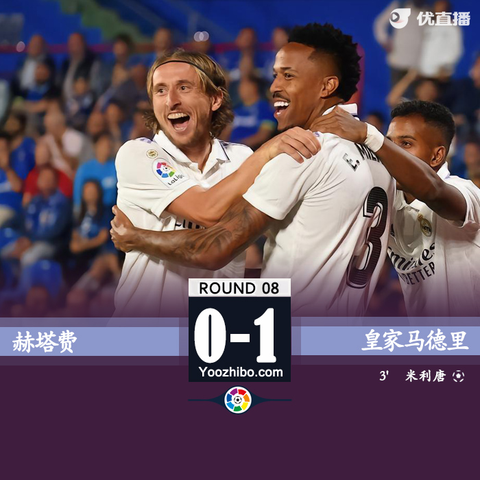 优直播讯北京时间10月9日03:00,西甲联赛第8轮,赫塔费迎战皇家马德里。上半场比赛,莫德里奇助攻米利唐头球破门,莫德里奇、罗德里戈尝试了多次远射。半场战罢,皇马1-0赫塔费。下半场比赛,皇马禁区内连续3脚打门被解围,众将多次远射均未能破门。最终全场比赛结束,皇马客场1-0赫塔费。