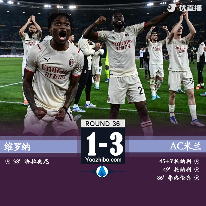 优直播讯5月9日讯 北京时间5月9日凌晨2点45分,2021-22赛季意甲第36轮在本特戈蒂球场展开角逐,AC米兰客场挑战维罗纳。上半场法拉奥尼先拔头筹,莱奥助攻托纳利扳平,下半场莱奥再次助攻托纳利反超,弗洛伦齐替补锁定胜局。最终AC米兰客场3-1逆转维罗纳,积分榜方面,AC米兰积80分领先国米2分,重回榜首,维罗纳积52分位列第9。