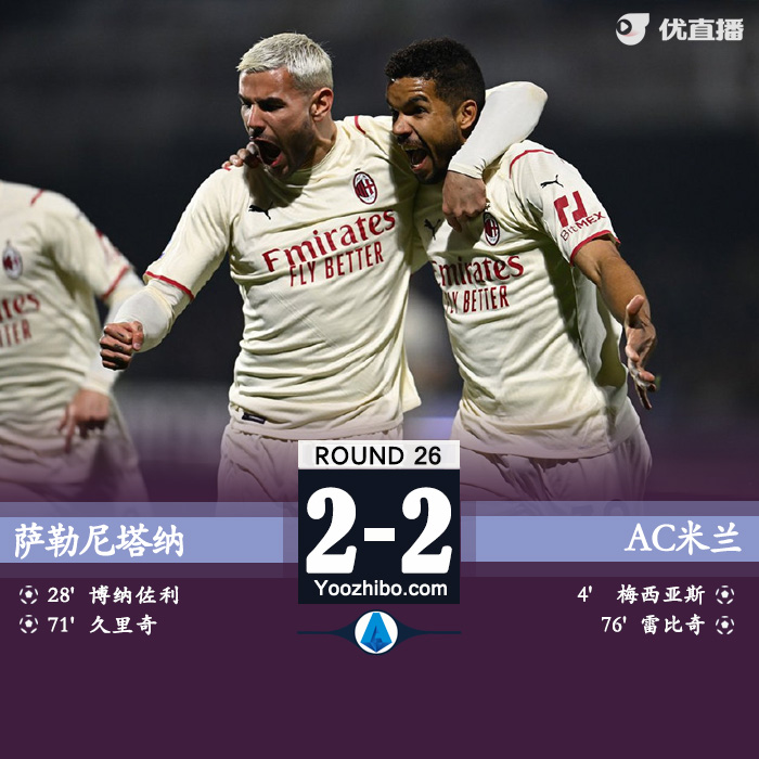 优直播2月20日讯 北京时间凌晨3:45,2021-22赛季意甲联赛第26轮,AC米兰客场挑战萨勒尼塔纳。上半场,特奥送出直塞,梅西亚斯破门,博纳佐利利用一次反击机会为萨勒尼塔纳扳平比分;下半场久里奇帮助萨勒尼塔纳反超比分,不过很快雷比奇取得进球,最终AC米兰2-2萨勒尼塔纳。