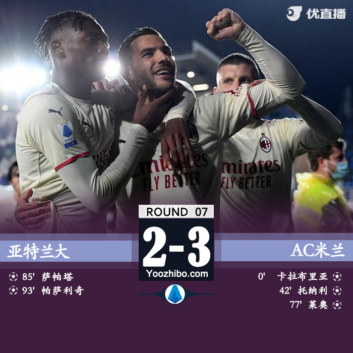 优直播10月4日讯 北京时间10月04日星期一02:45,意甲第7轮亚特兰大对阵AC米兰。上半场,卡拉布里亚开场28秒超级闪击,托纳利破门,迈尼昂频频救险,AC米兰半场2-0领先亚特兰大。下半场,特奥奔袭助攻,莱奥破门,梅西亚斯手球被判罚点球,萨帕塔点射扳回一城,帕萨利奇补时再入一球。最终,AC米兰客场3-2战胜亚特兰大,红黑军团升至联赛第二。
