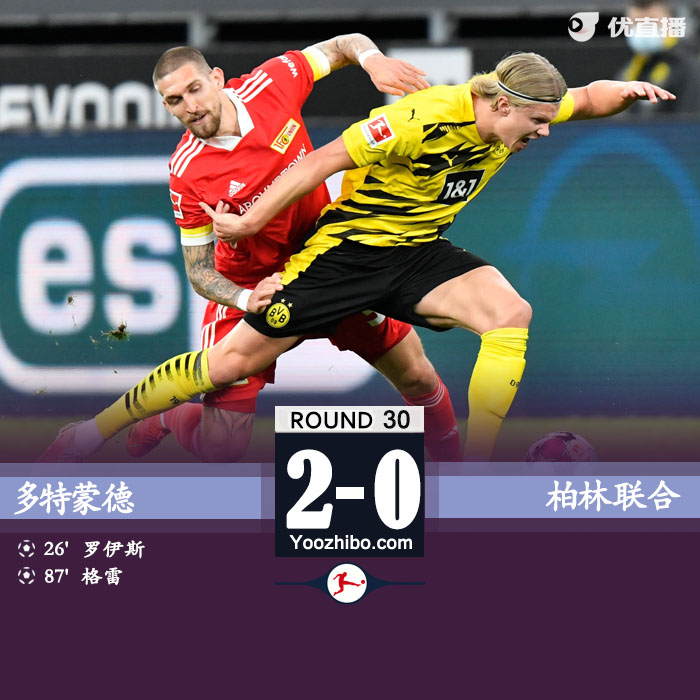 优直播4月22日讯 北京时间4月22日凌晨2时30分,2020-2021赛季德国足球甲级联赛第30轮展开角逐,多特蒙德坐镇伊杜纳信号公园球场迎战柏林联合。上半场,哈兰德主罚的点球被门将扑出,罗伊斯补射破门,多特半场1-0领先柏林联合。下半场,柏林联合球员克鲁泽任意球攻门击中立柱,随后格雷罗破门为多特锁定胜局。最终多特蒙德主场2-0击败柏林联合。本轮战罢,多特蒙德继续排名第五,距离第四名还差4分。